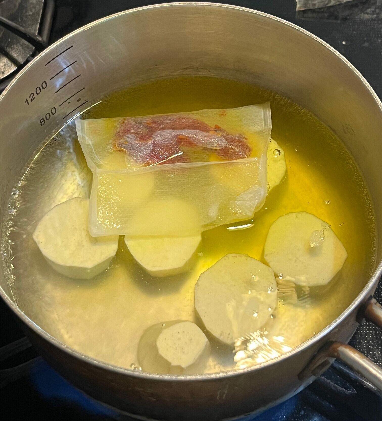 3)水けを切ったさつまいもとくちなしの実を鍋に入れ、かぶるくらいの水を入れ火にかけ、くしがすっと通るくらいまで火を通す
