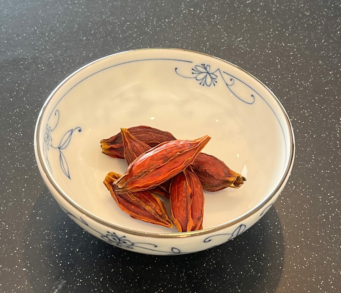 2)くちなしの実を半分に割り、お茶パックなどに入れてバラバラにならないようにしておく