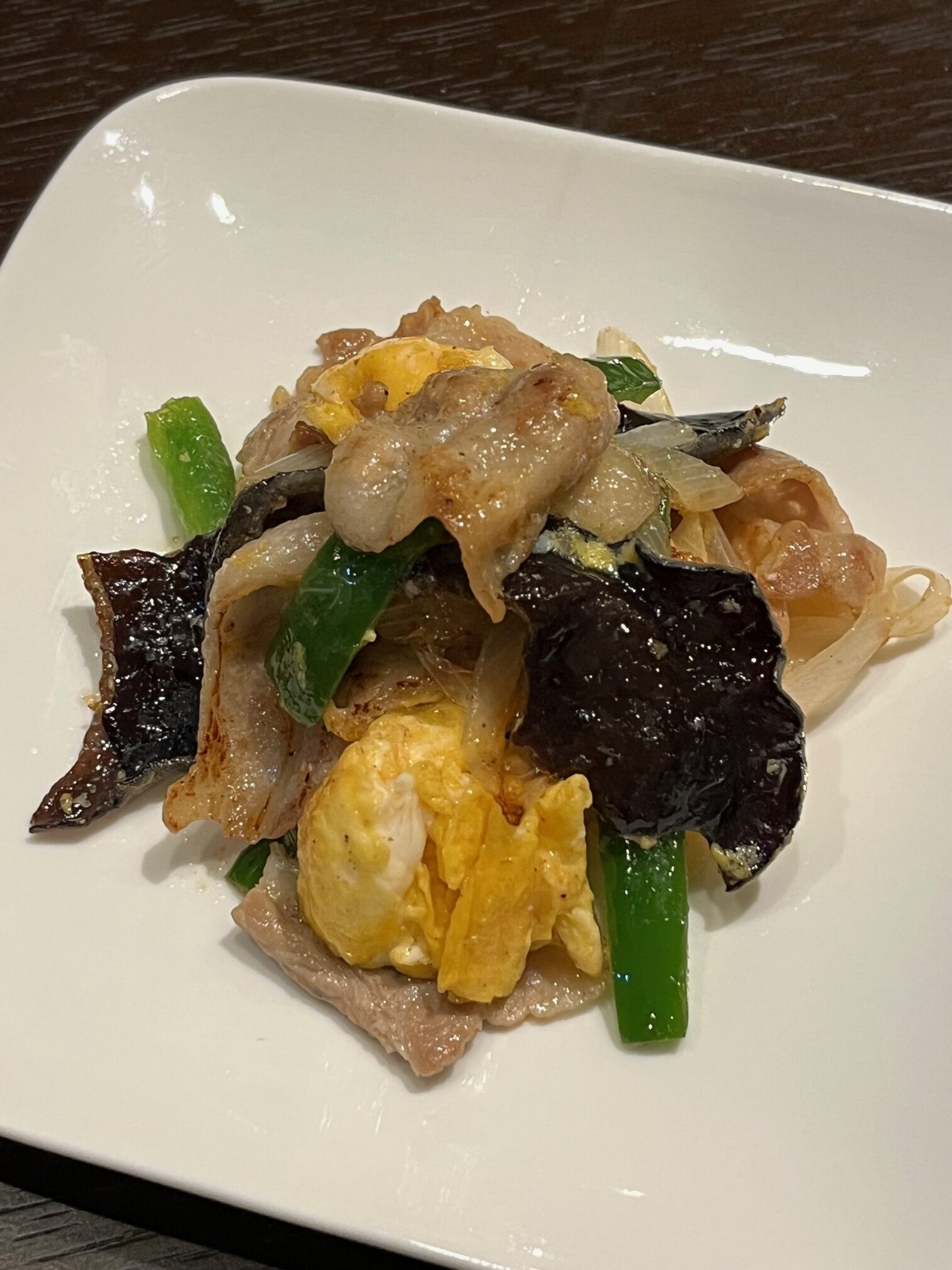 ⑥ 肉に火が通ったらきくらげ、ピーマン、白ネギを加えて野菜がしんなりするまで炒める